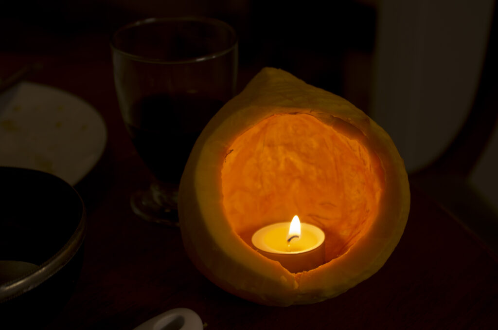 Voeux 2021 : La douceur après les années COVID, La simplicité d’une courge ouverte et d’une lampe au coeur de l’hiver, et hommage à Georges De la Tour en photographie.