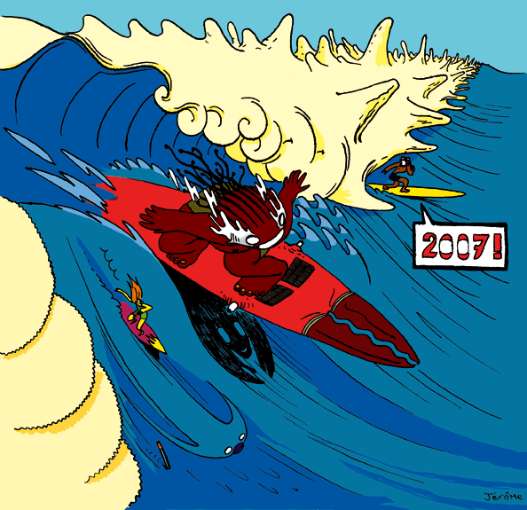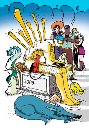 Voeux 2008 – Ici un autoportrait avec mes personnages de bande dessinée : Semsono, Verbier, Ravi & Mala, Les pods, fantômes et une sirène de combat d’Aleas Corpus. Au devant, un loup s’invite.