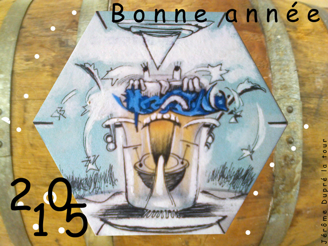Voeux 2015 : Une des plus moches cartes de voeux que j’ai réalisée (il en faut aussi !), mais ce bock de bière customisé me plaisait beaucoup. 2015 sera l’année de ma première exposition personnelle de peintures, à la mairie de Lyon 1er.