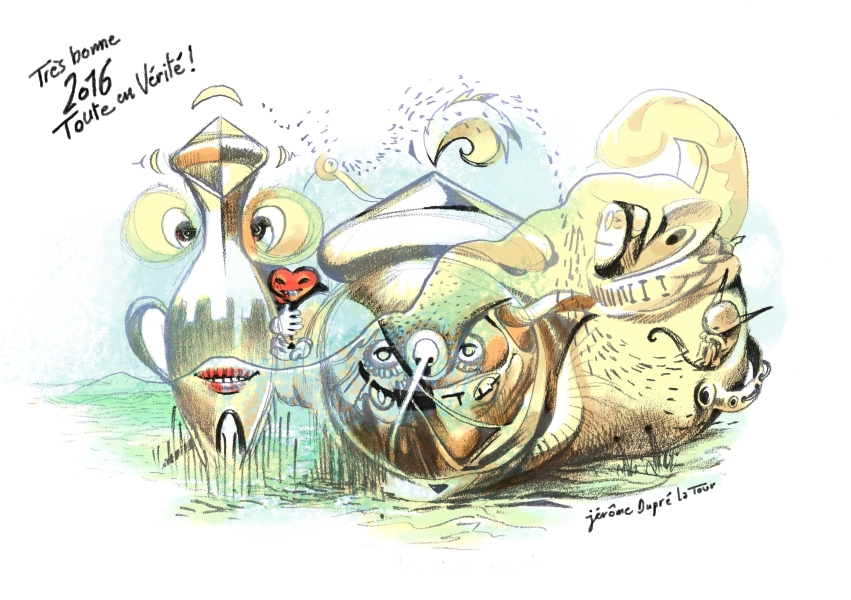 Voeux 2016 : Toute en Vérité, en liberté de dessin. Sans doute une des cartes qui me ressemble le plus. On y retrouve les thèmes qui me sont chers : Fécondité, rire, abstraction et autodérision.